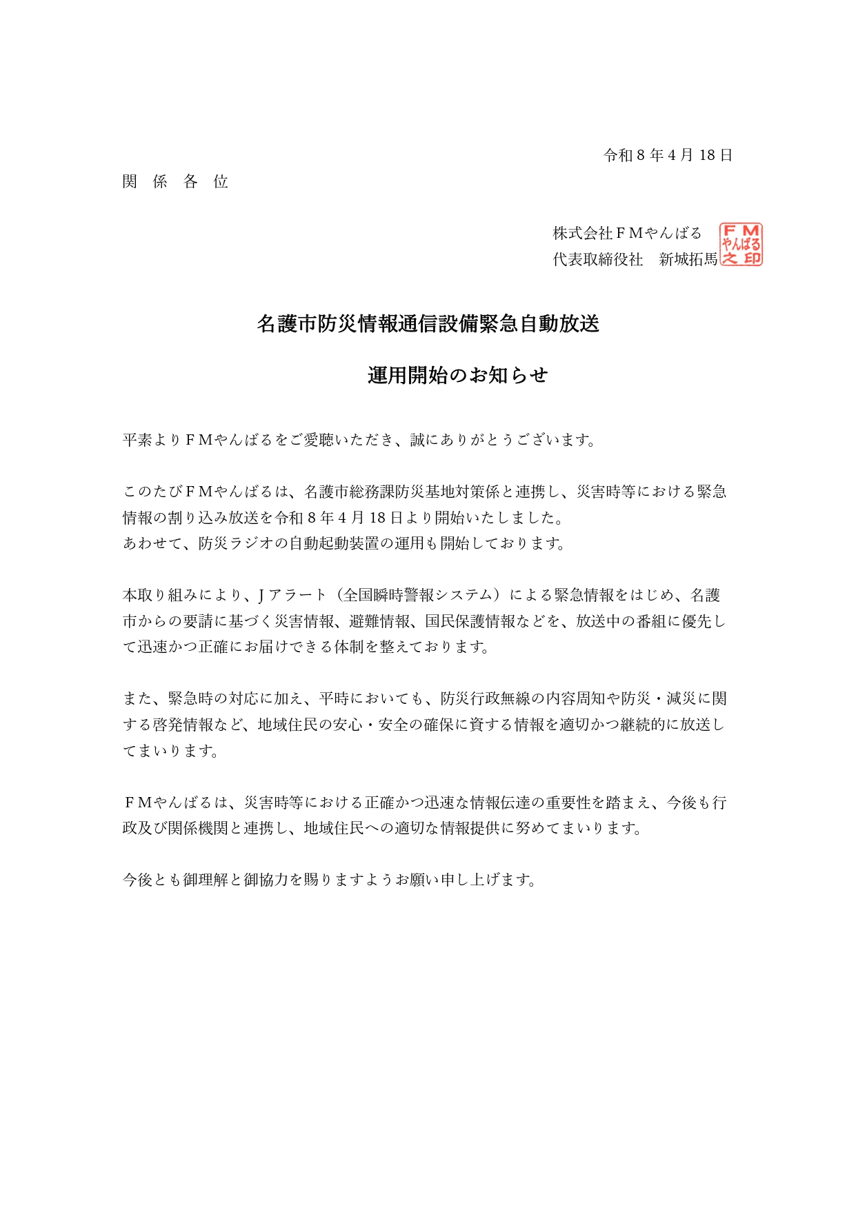2026.4.16名護市防災情報通信設備緊急自動放送運用開始のお知らせ
