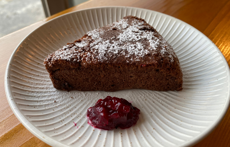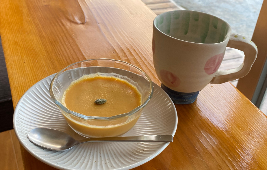 メニューは、ミルクコーヒー、ソイミルクコーヒー(以上500円)、「紅茶」(400円)、自家焙煎(ばいせん)豆を使う「元氣ブレンド」(450円)のほか、自社栽培するモリンガを使った「モリンガティー」(400円)、沖縄のシナモン・カラキやモリンガの根と葉を抽出した「きまぐれ薬膳スープ」(500円)など。カボチャ丸ごと一つを使った「かぼちゃプリン」(300円)や店内で作る豆乳の副産物・おからで作る「おからチョコケーキ」(400円)も提供します。