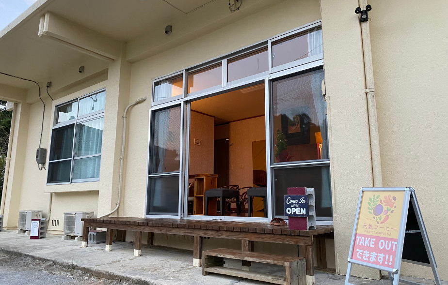 コーヒーを提供する同店。一軒家を活用した店舗の面積は約5坪。席数は12席。就労支援B型事業所「光と風の和 はんぱたやー」を運営する「源氣」が名護市内で2拠点目の施設外就労支援先として出店しました。